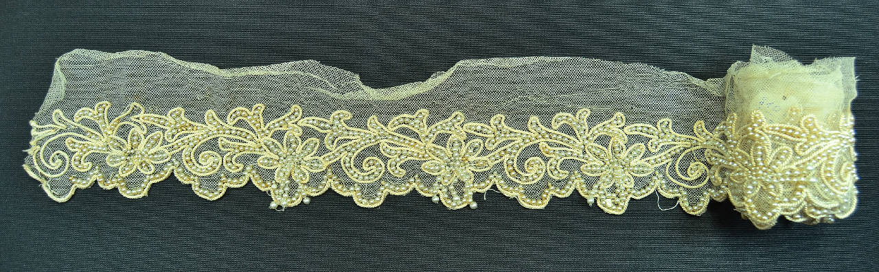 tulle in cotone crema ricamato con un tralcio fiorito e stilizzato con perline e cordoncino in seta crema; gli stessi materiali rifiniscono l'orlo smerlato.