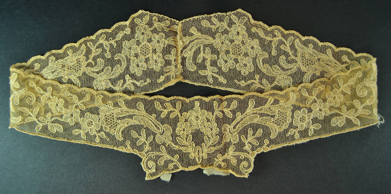 Elemento sagomato cucito ad anello, forse parte di un abito femminile, in pizzo avorio: fondo a maglie esagonali e disegno floreale ad andamento speculare che parte da un motivo a ghirlanda. Bordo inferiore smerlato. Frammenti di taffetas avorio.