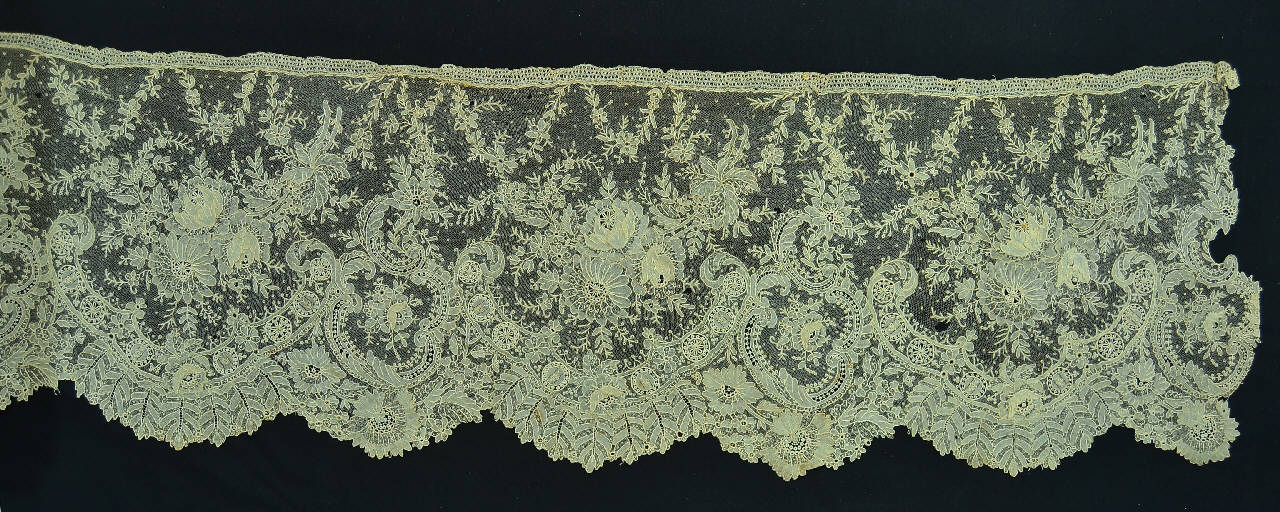 Bordo in lino avorio tipo Point de Gaze: sul fondo a rete si staglia un ricco e opulento motivo a ghirlande floreali naturalistiche, impreziosiscono il disegno volute e girali sia fitomorfi che ornati da medaglie e motivi a raggiera; l'orlo, dall'andamento smerlato. è arricchito da motivi floreali e da foglie stilizzate. Il disegno, sollevato da un filato più spesso, è definito da reti di diverse tipologie. Alto piede a fuselli cucito al bordo superiore.