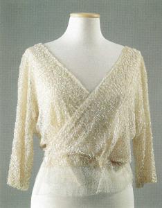 Corpetto incrociato, con maniche lunghe a chimono con tassello inserito sotto l'ascella. Allacciatura costituita da nastro di gros interno e automatici nel tratto sovrapposto del giro vita.\nDalla vita in su, il capo è ricamato a mano con filze di paillettes trasparenti iridescenti che formano un disegno vermiculare, mentre nella parte da inserire nella gonna il tulle è liscio.
