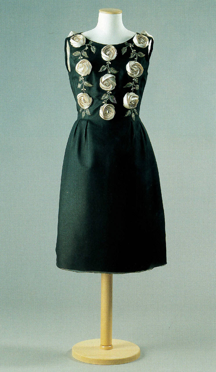 L'abito intero da sera, di organza a due strati, con scollo a barchetta e senza maniche, ha il busto sagomato con quattro pince che si aprono in vita in modo da diventare sfondi piega che danno ampiezza alla gonna. Sul corpetto sono ricamati a mano tralci simmetrici e paralleli di rose. Le corolle sono realizzate con spirali di raso bianco sbieco, applicate a rilievo e decorate con paillettes, i pistilli di canutiglia e perline madreperla, mentre i gambi e le foglie sono ad applicazione di perline, canutiglie e strass bianco-madreperla.\nIl modello è foderato da una sottoveste di raso dalla identica foggia e da una sottogonna di taffetas con un alto bordo impunturato, entrambe avorio.