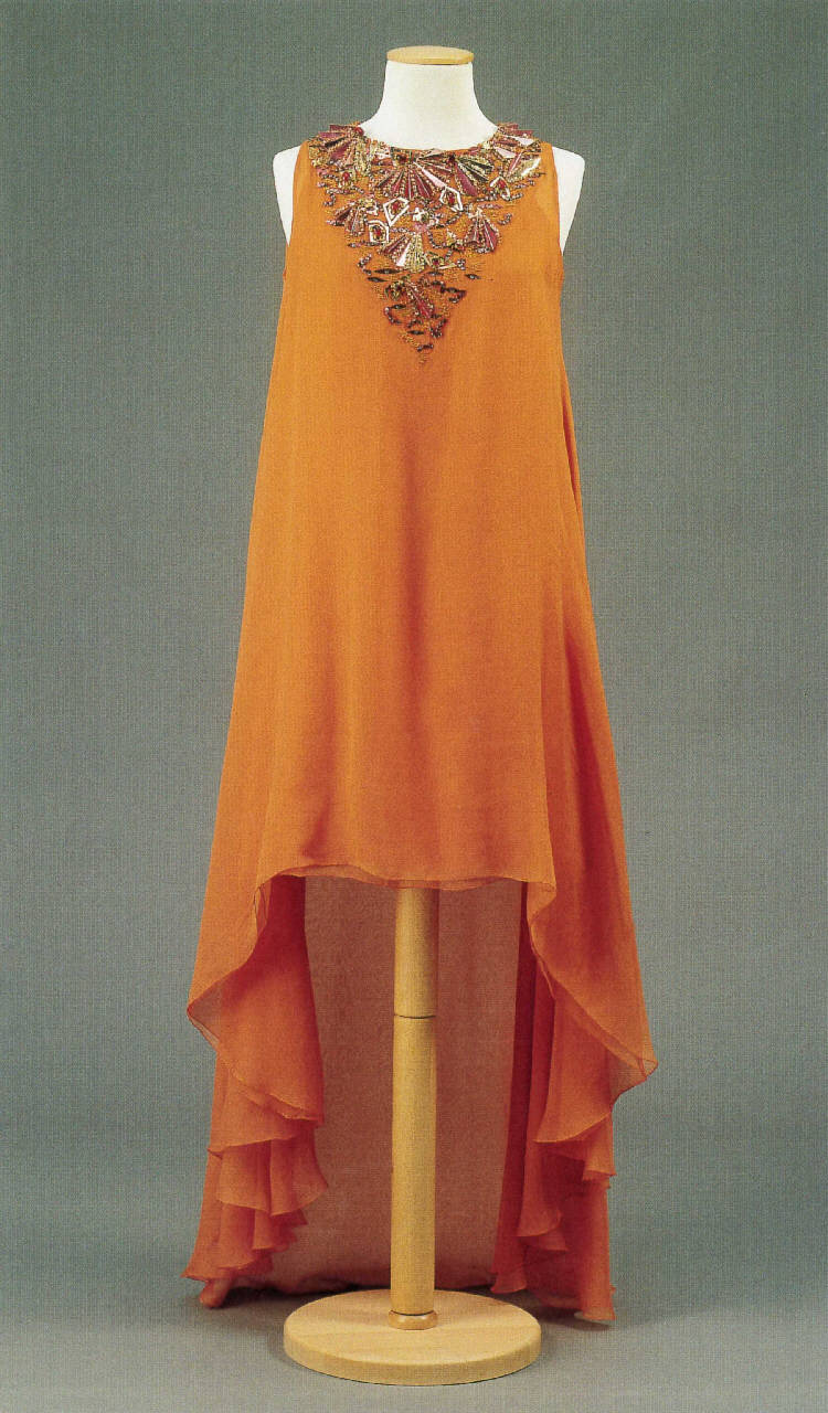 Il modello da sera è costituito da una sottoveste a tubino di chiffon foderato, con scollatura rotonda e senza maniche, e da un abito di chiffon usato doppio, girocollo e con spalle all'americana. Il capo è realizzato in un unico telo a ruota, sagomato all'orlo in modo da risultare corto davanti e con appoggio dietro. Un importante ricamo a mano ad applicazione di fiori stilizzati, collocato alla scollatura, forma un motivo a punta, più pronunciato sul dorso