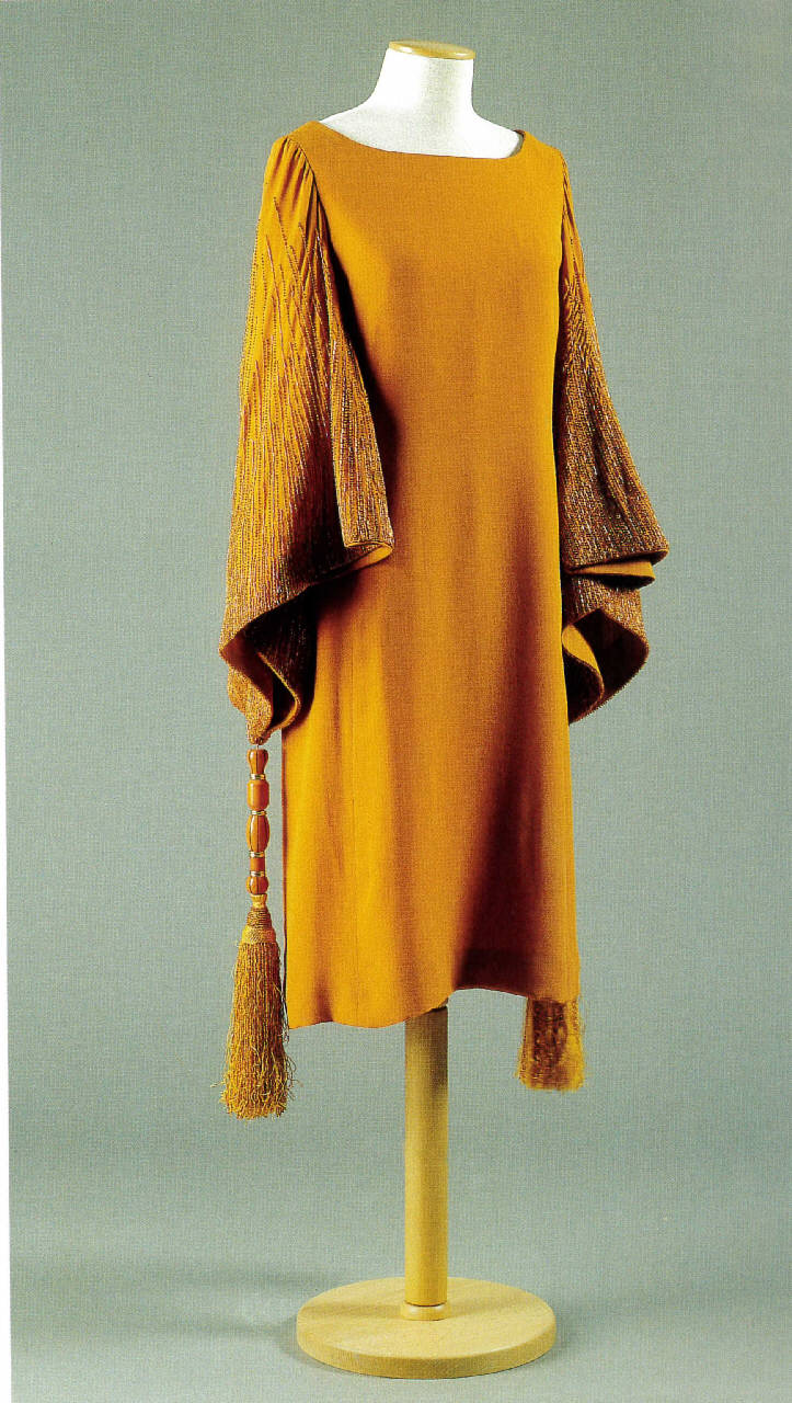 - NOTIZIE STORICO CRITICHE Il modello dell'abito è stato scelto in collezione e realizzato con tessuto Taroni. A Venezia, durante una festa, Silvana Bernasconi incontrò una signora con lo stesso modello, in blu e senza pendenti alle maniche (alla maison Capucci risulta che fu realizzato per la contessa Maresca di Serra Capriola). L'abito è completato da scarpe décolleté arancio di Sebastian.\nI due pendenti sono stati staccati e smontati, solo in fase di restauro ricomposti.