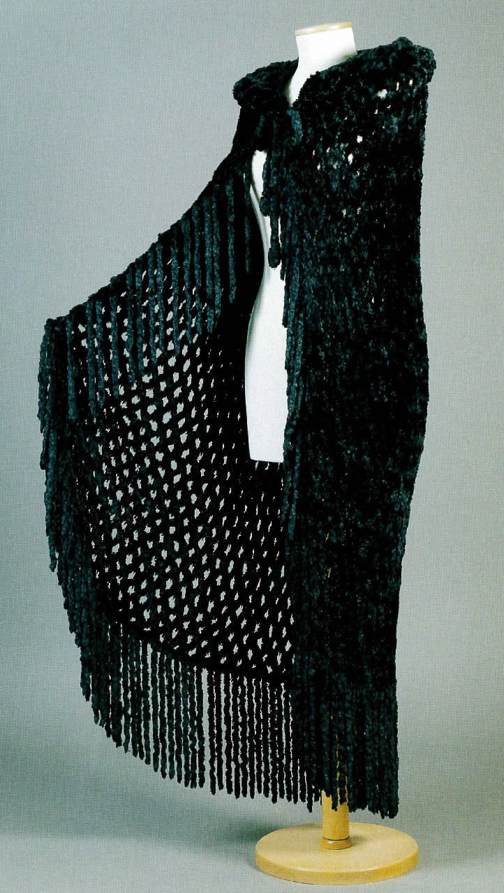 Cappa di rete di ciniglia in un solo telo, arrotondato nei davanti e totalmente bordato da un'alta frangia nello stesso filato, con cappuccio e lacci da annodare al collo.