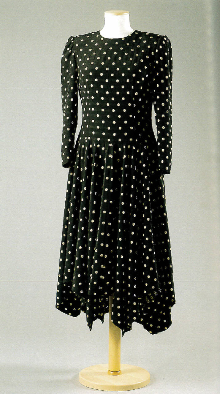 Abito intero tagliato a vita bassa. Il corpetto, sagomato con pince, è a giro collo e presenta maniche lunghe montate arricciate e spalle imbottite. La gonna arricciata è formata da sei teli sbiechi tagliati a fazzolletto, che formano un orlo irregolare a punte.