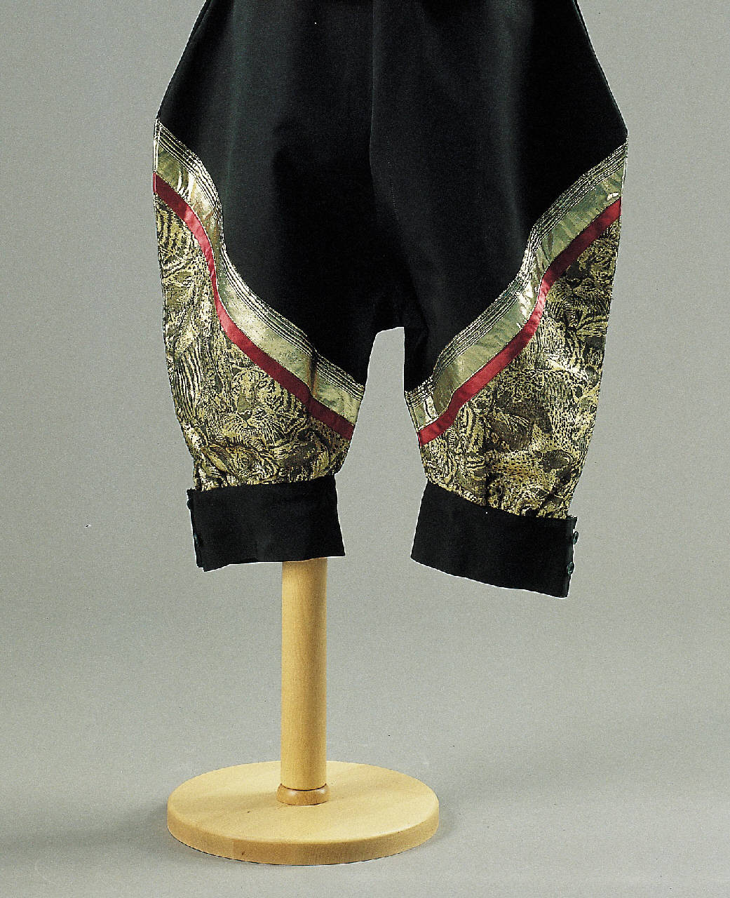 Pantaloni lunghi tagliati con cavallo basso e gambe arrotondate, in modo che risultino ampie al centro e tiprese in fondo, dove sono trattenute da due fasce abbottonate lateralmente. Sulle gambe sono applicati due triangoli di lamé animalier bordati da un nastro rosso e tessuto a righe.