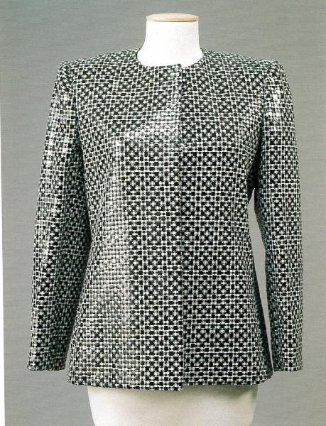 - NOTIZIE STORICO CRITICHE Silvana Bernasconi afferma che la giacca è confezionata con il primo tessuto plastificato lucente; succesivamente son ostati realizzati altri tessuti dello stesso genere, quali misti lurex e metallo. Ha acquistato la giacca su consiglio del marito, che l'aveva vista in sfilata.