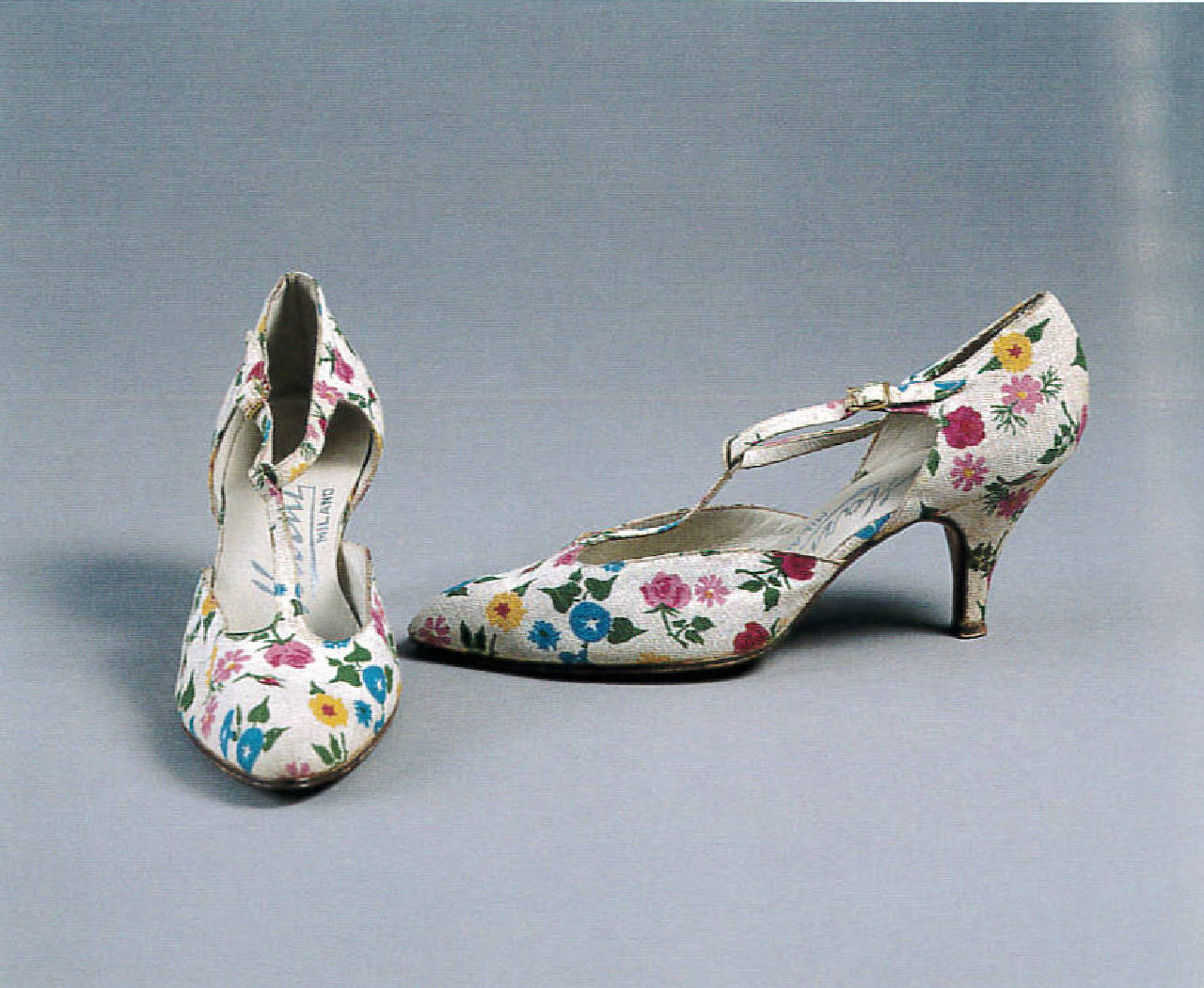 Scarpa con tomaia in due pezzi di tessuto a fiori che forma allacciatura a T con cinturini e fibia. Scollatura profonda e sciallata ai lati. Punta sfilata, tacco medio ricoperto. Sottopiede e fodera di pelle bianca. Suola di cuoio.