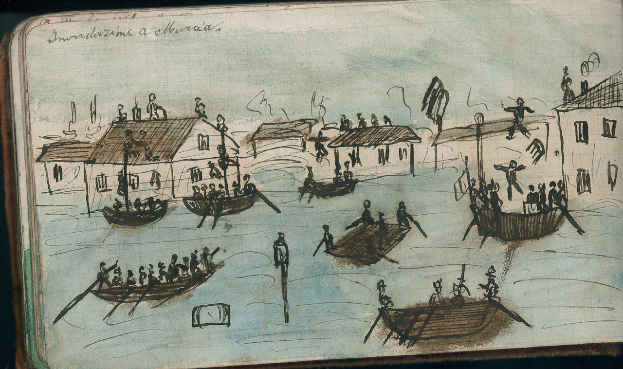 - NOTIZIE STORICO CRITICHE Serie di disegni conservati all'interno di un taccuino posseduto dall'artista Camillo Ghisi.\nScena raffigurante l'inondazione a Murcia.