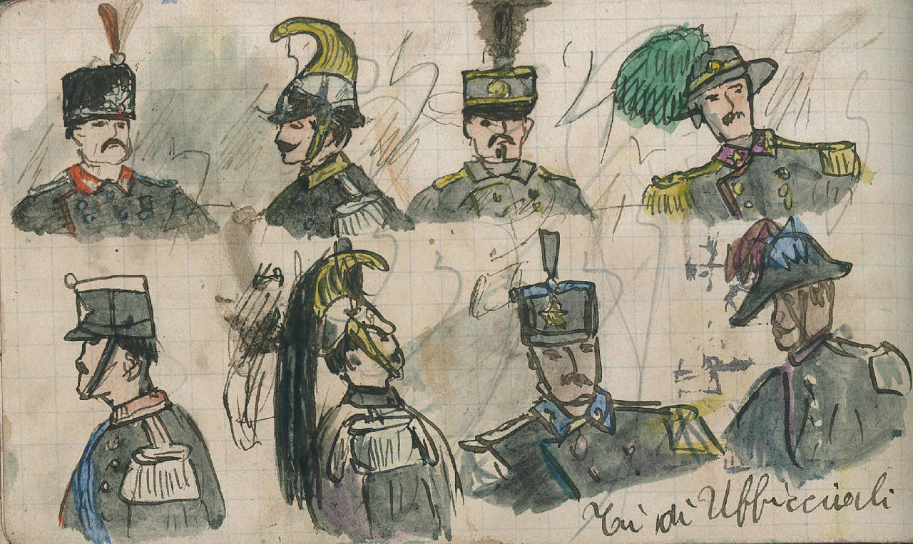 - NOTIZIE STORICO CRITICHE Serie di disegni conservati all'interno di un taccuino posseduto dall'artista Camillo Ghisi.\nOtto mezzi busti di ufficiali in uniforme.