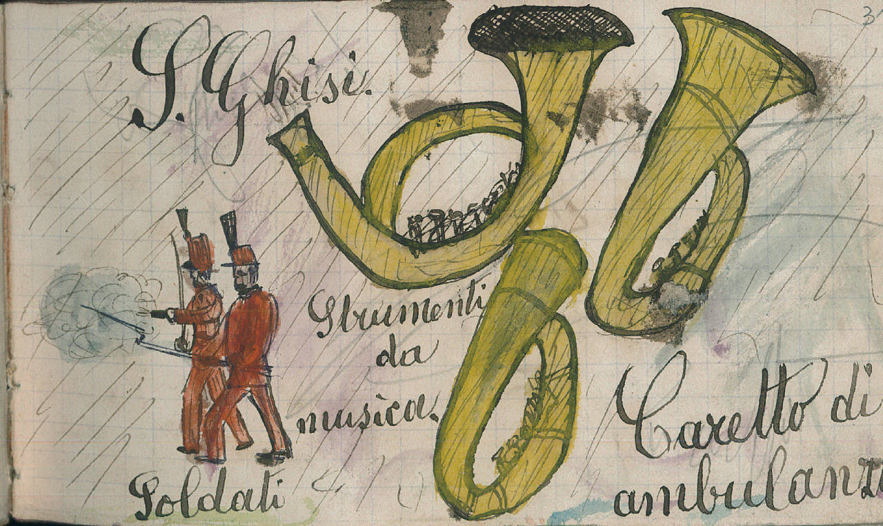 - NOTIZIE STORICO CRITICHE Serie di disegni conservati all'interno di un taccuino posseduto dall'artista Camillo Ghisi.\nSchizzi di alcuni strumenti a fiato e coppia di soldati.
