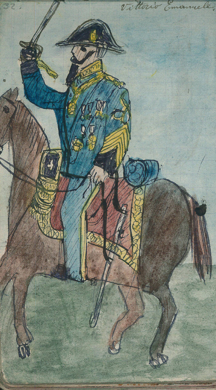 - NOTIZIE STORICO CRITICHE Serie di disegni conservati all'interno di un taccuino posseduto dall'artista Camillo Ghisi.\nRitratto di Vittorio Emanuele a cavallo.