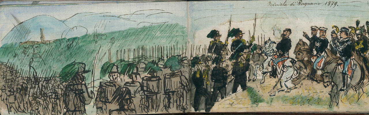 - NOTIZIE STORICO CRITICHE Serie di disegni conservati all'interno di un taccuino posseduto dall'artista Camillo Ghisi.\nScena raffigurante le truppe presso Pagnano nel 1879.