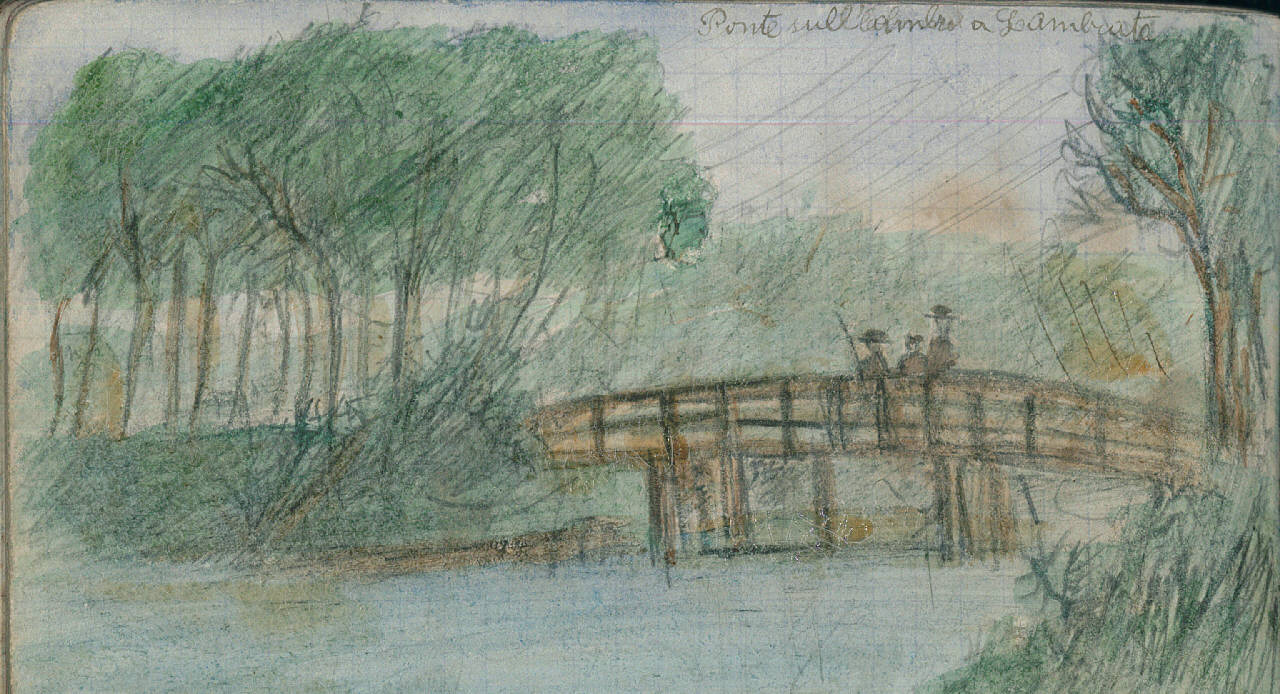 - NOTIZIE STORICO CRITICHE Serie di disegni conservati all'interno di un taccuino posseduto dall'artista Camillo Ghisi.\nScena paesaggistica con ponte e fiume Lambro presso Lambrate.