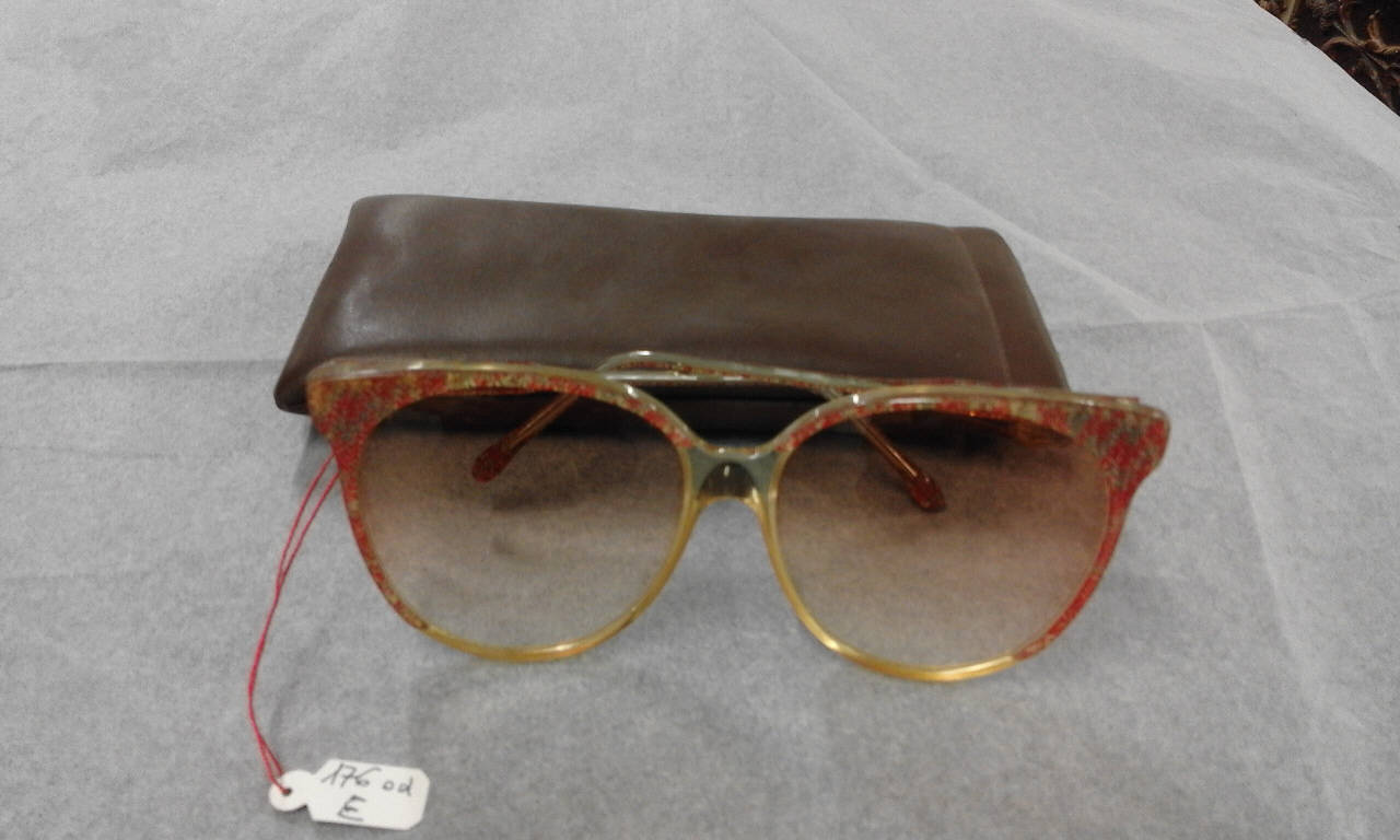 Occhiali da sole con montatura leggera a stampa rosa e verde, lenti ovali (?).\nConservati in un astuccio in pelle marrone.
