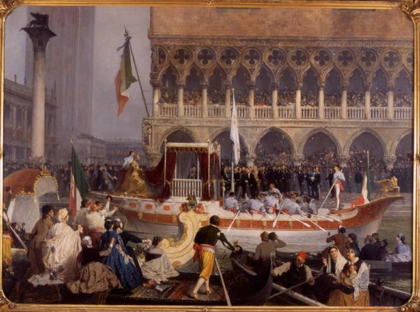 - NOTIZIE STORICO CRITICHE Grande dipinto con episodio storico-narrativo con figure in media scala inserite nel contesto urbano della città di Venezia. 7 novembre 1866, la liberazione di Veneto viene celebrata a Venezia con l'ingresso di Vittorio Emanuele II, sbarcato in piazza San Marco, davanti a Palazzo Ducale, accolto dalle autorità, dalla borghesia e dal popolo