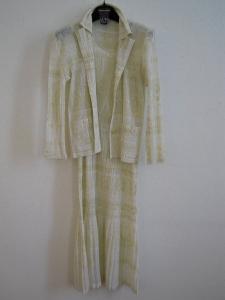 Completo panna con motivi orizzontali tono su tono composto da abito e giacchino.