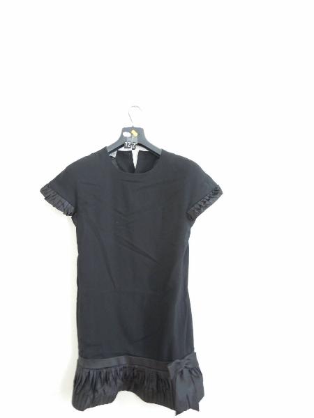 Abito corto in panno nero e raso (?) con balza e fiocco finale.
