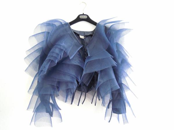 Coprispalle con balze di tulle azzurro con bottoncini.