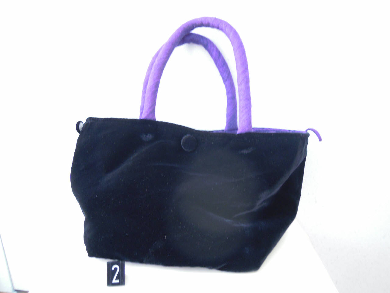 Borsa velluto nero-viola con piccoli manici e chiusura a bottone.