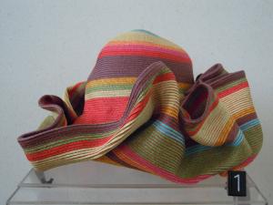 Cappello di paglia a tesa larga morbida con motivi orizzontali di vari colori.