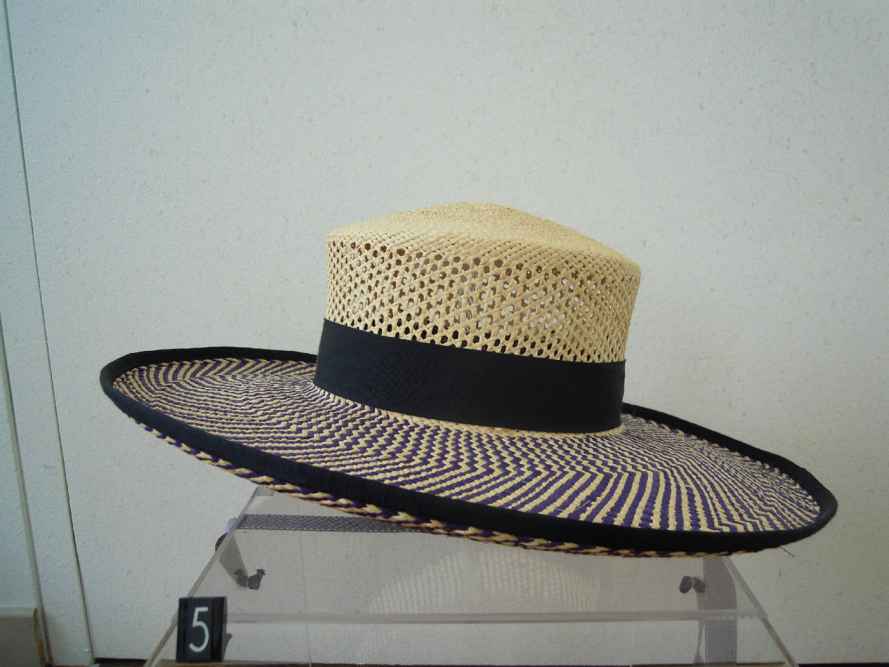 Cappello di paglia con cupola traforata, cinta e profilatura in tessuto scuro, tesa larga con intrecci di paglia colorata blu e naturale.