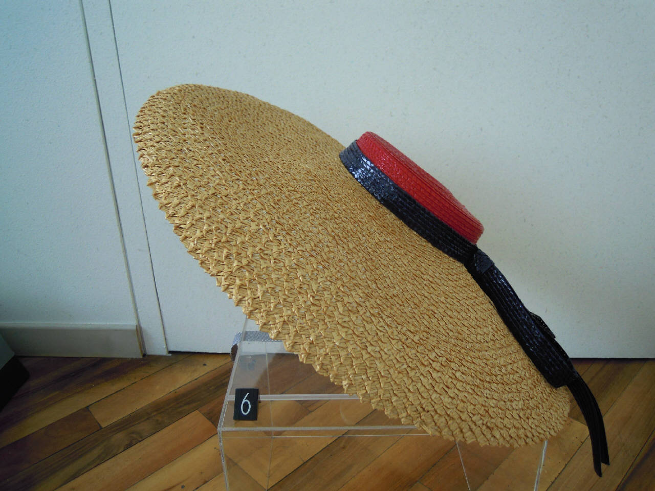 Cappello di paglia con ampia tesa lavorata, cupola laccata rosso e cinta laccata blu con lunga coda.