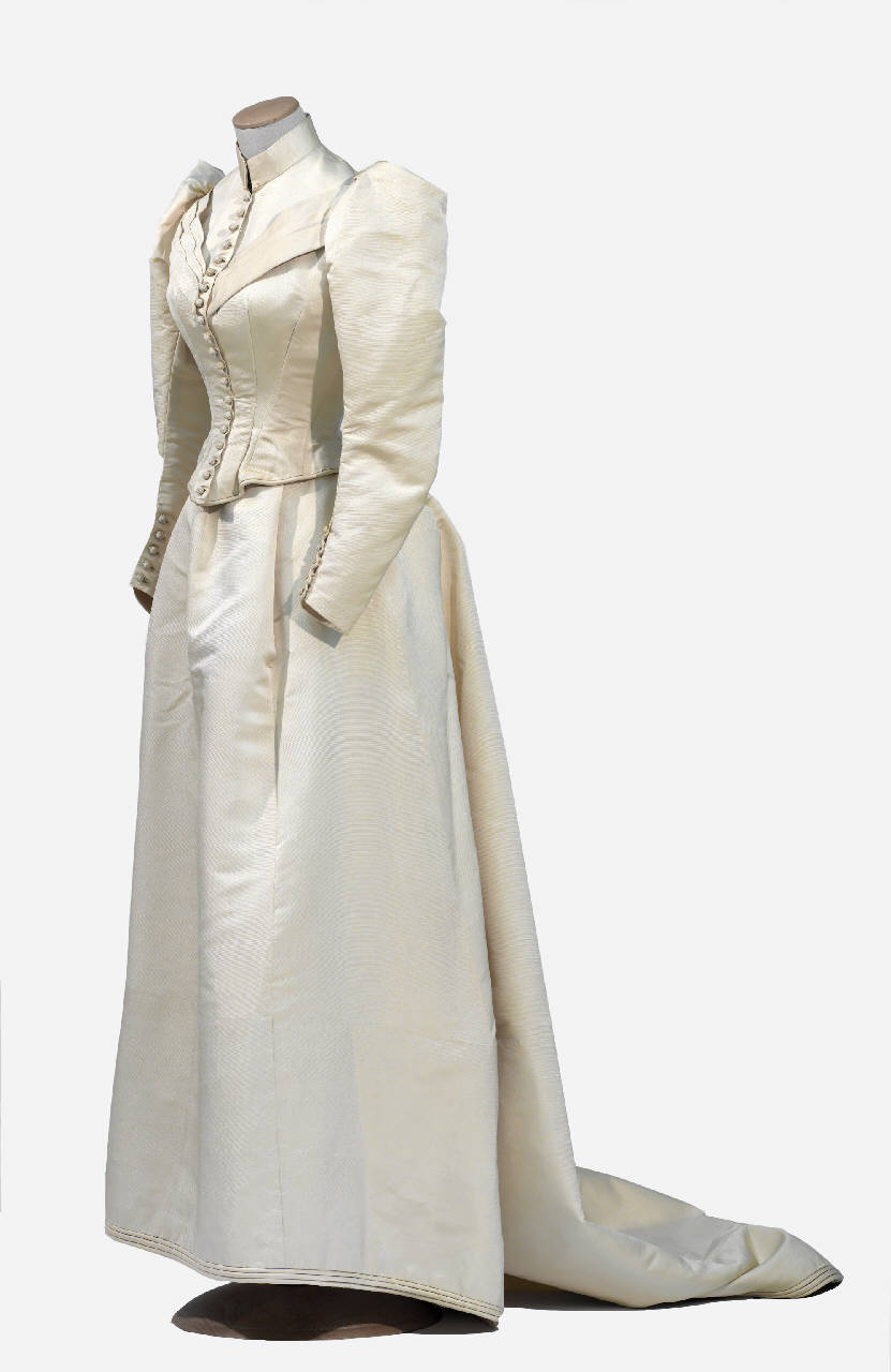 Abito lungo composto da corpino e gonna in cannellato avorio. \nCorpino aderente steccato lungo poco oltre la vita, a punta davanti e dietro, profilata da sottile burlotto imbottito. Collo a cinturino, apertura totale anteriore centrale chiusa da 20 bottoncini in legno ricoperti ad ago in filo di seta. Due bande decorative a pieghe inserite nella cucitura dei giromaniche si riuniscono sul seno a formare una V. Maniche lunghe a prosciutto, chiuse al fondo da 5 bottoncini. Fodera in leggero taffetas avorio.\nGonna a cupola asimmetrica con strascico, in 2 teli e 4 gheroni. Ristretta al punto vita da rade pieghe sul davanti e da fitta pieghettatura al centro dietro. Apertura sul davanti a sinistra con ganci. All'orlo 3 sottili burlotti imbottiti; all'interno balza a fitte pieghe in taffetas avorio con bordi a zig-zag tagliati al vivo.