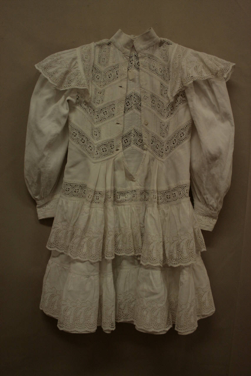 abito intero a vita bassa, in piquet bianco. Corpino con decori a zig zag dati da inserti in strisce di broderie anglais e piegoline verticali. Collo a cinturino, apertura posteriore centrale con bottoni. Maniche lunghe, arricciate, strette al fondo da polsino. Sulle spalle sono applicate due alette arricciate in tela ricamata bianca. Gonna svasata, decorata con due gale arricciate in tela ricamata bianca.