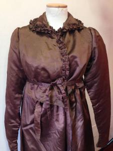 abito lungo di linea impero, in raso color bronzo. Corpino con scollo a V, a vita alta, aperto anteriormente e incrociato; l'apertura è fermata con cinturini da annodare. Collo semplice profilato, come l'apertura, da ruche nello stesso tessuto. Dietro in un pezzo pressochè romboidale, con linea delle spalle molto arretrata. Fodera in diagonale non tinta che sul davanti forma bustino staccato, con apertura anteriore chiusa da laccio passante in occhielli, irrigidita da stecca. Gonna a 5 teli e 2 gheroni; sul dietro fittamente arricciata al centro e cucita al corpino fino ai fianchi; sul davanti è staccata dal corpino e arricciata da coulisse. \nL'abito è stato modificato, in particolare nel collo e quarti anteriori.