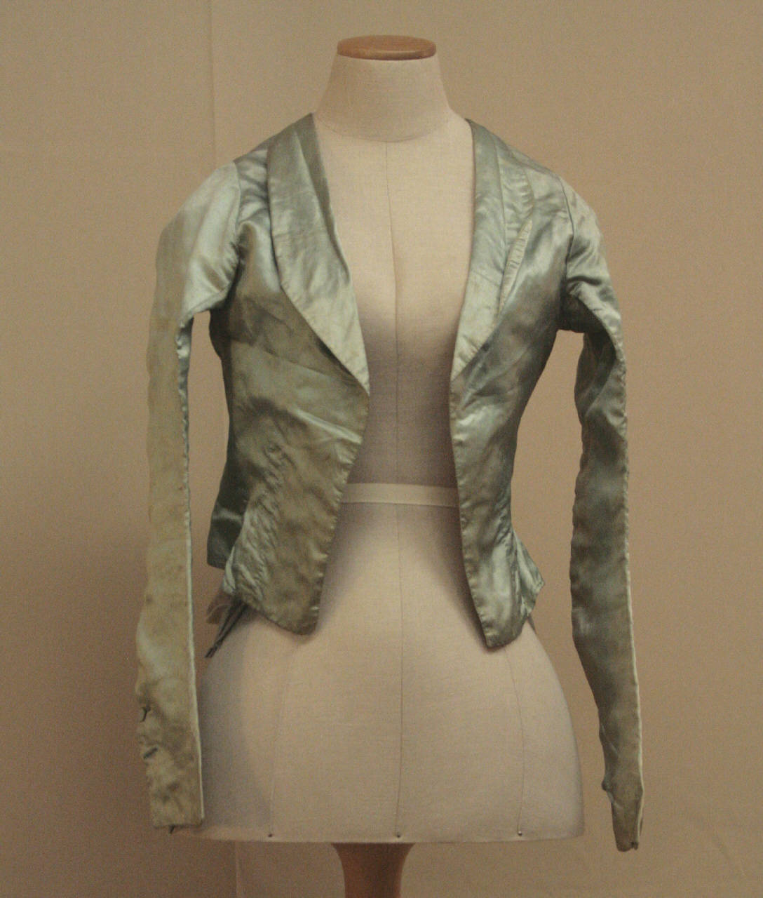 giacca corta in vita in raso celeste polvere. Davanti in due pezzi, scollo a V con collo sciallato; apertura centrale snza sistema di chiusura. Linea delle spalle spostata sul dietro, dorso in due pezzi. La svasatura lungo l'orlo è data da due piccoli gheroni inseriti sui fianchi e al centro dietro. Maniche lunghe a coprire la mano, sagomate, con spacco al fondo chiuso da 2 bottoni ove formano piccola coda. rivestiti nello stesso tessuto.\nFodera in tela bianca; sul davanti due strette bande (una con stecca) cucite all'interno delle mostre permettono di chiudere la giacca mediante lacio passante in occhielli tondi.