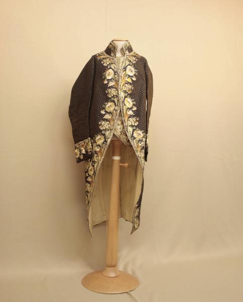 Completo formato da marsina e gilè.\nMarsina in velluto riccio operato marrone scuro a minuto decoro geometrico, ricamato in seta con motivo di fiori di cardo con foglie e fiordalisi.\nAlto collo a cinturino (h 10cm), mostre stondate con 10 bottoni rivestiti (occhielli non presenti) e chiuse all'altezza del petto da 3 ganci.\nFalde sfuggenti verso il dietro. Tasche sui fianchi con patta sagomata e 3 bottoni decorativi nel sottotasca (1 perduto).\nManiche lunghe, sagomate con alto/basso paramani con 3 bottoni decorativi.\nDorso stretto che scende poco sotto il punto vita; spacchi laterali cuciti a tratti entro piega, decorati da bottoni in alto; spacco centrale sovrapposto.\nFodera in taffetas avorio, forse di sostituzione.\nGilè in gros de tour avorio, ricamato analogamente alla marsina. Alto collo a cinturino, mostre diritte chiuse da 7 bottoni e occhielli corrispondenti dal petto al fondo; corte falde a punta, con tasche e patte sagomate; 3 bottoni nel sottotasca. Dorso in tela naturale, regolabile con 2 coppie di lacci.