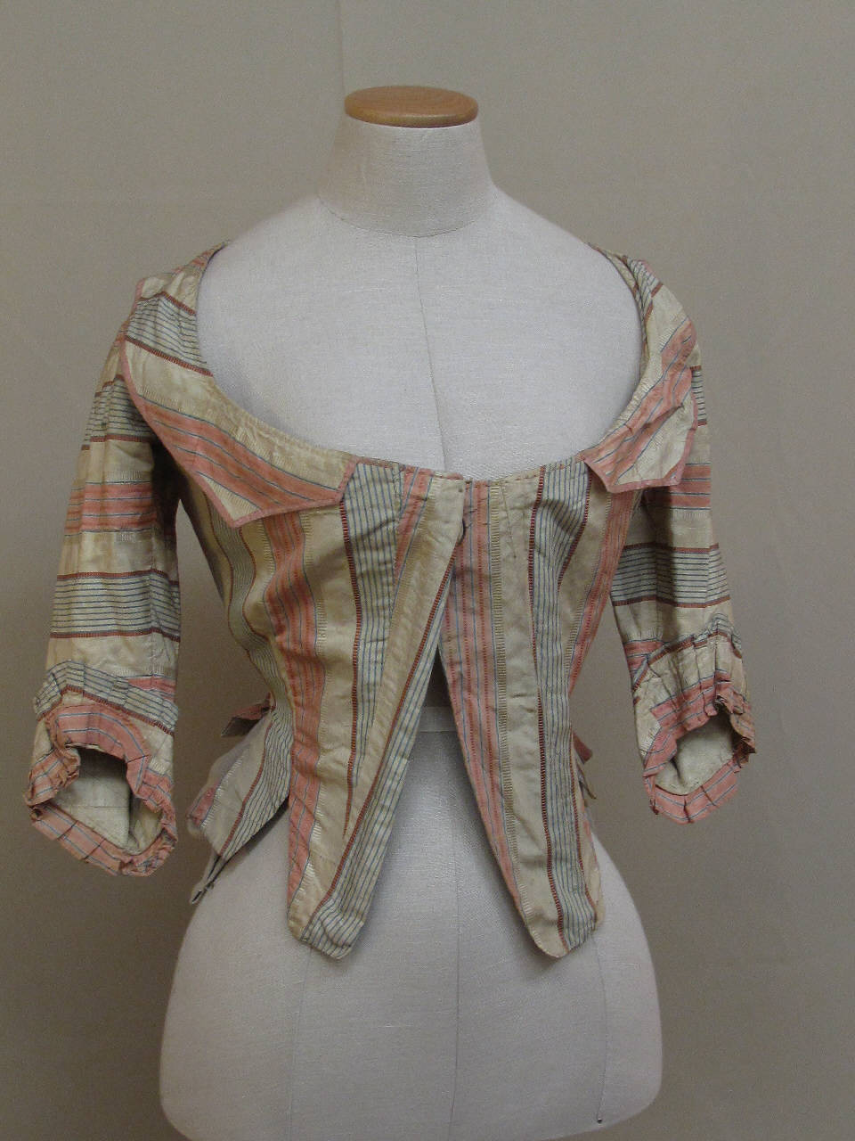 Corpino in pekin (taffetas e cannellato) rigato avorio e rosa, con sottili rigature azzurro e ruggine. Aderente con piccole falde rettangolari, stecca nell'apertura anteriore e punta centrale tronca che scende oltre la vita. Davanti in due pezzi sagomate da pinces; apertura centrale con occhielli tondi per laccio passante nascosta da mostra sovrammessa. Scollo ovale molto ampio, con collo piatto a punta sul dietro e sagomato sul dvanti, profilato da nastro in taffetas rosa. Spalle spostate sul dietro, maniche a tre quarti (tagliate con lunghezza in senso trama), arricciate e sagomate; profilate al fondo da alta ruche con pieghe a cannone. Dietro con dorso ampio, con spacco centrale e due pieghe sotto la vita. Doppiato in tela bianca. \nIl corpetto appare modificato, probabilmente allargato al centro davanti e variata la forma della punta anteriore.