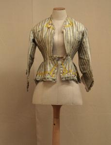 giacca aderente con falde svasate lunghe ai fianchi, in garza rigata bianca e blu, con minuto motivo chinè in nero nella riga bianca. Scollo a V, modificato da girocollo originale, profilato da ruches di tela bianca e decorato da finti risvolti disegnati da nastro in taffetas giallo applicato. Davanti in due pezzi modellati da pinces, apertura centrale chiusa da ganci dallo scollo alla vita, con risvolti triangolari presso l'orlo. Spalle appena spostate sul dietro. Dietro in tre pezzi, dorso e fianchette, con falde svasate che formano coda con spacco centrale e pieghe. Piccola martingala in taffetas giallo decorata da 2 bottoni. Spacchi sui fianchi con motivo di risvolti triangolari. Maniche lunghe, sagomate, leggermente arricciate, decorate al polso da finto paramani. orlo, risvolti e finti paramani decorati da nastro in taffetas giallo e bottoni rivestiti gialli. Orlo e finti paramani con ruches dello stesso tessuto.\nDoppito in tela bianca cerata, imbottitura nella zona anteriore delle spalle. Nastro stringivita.