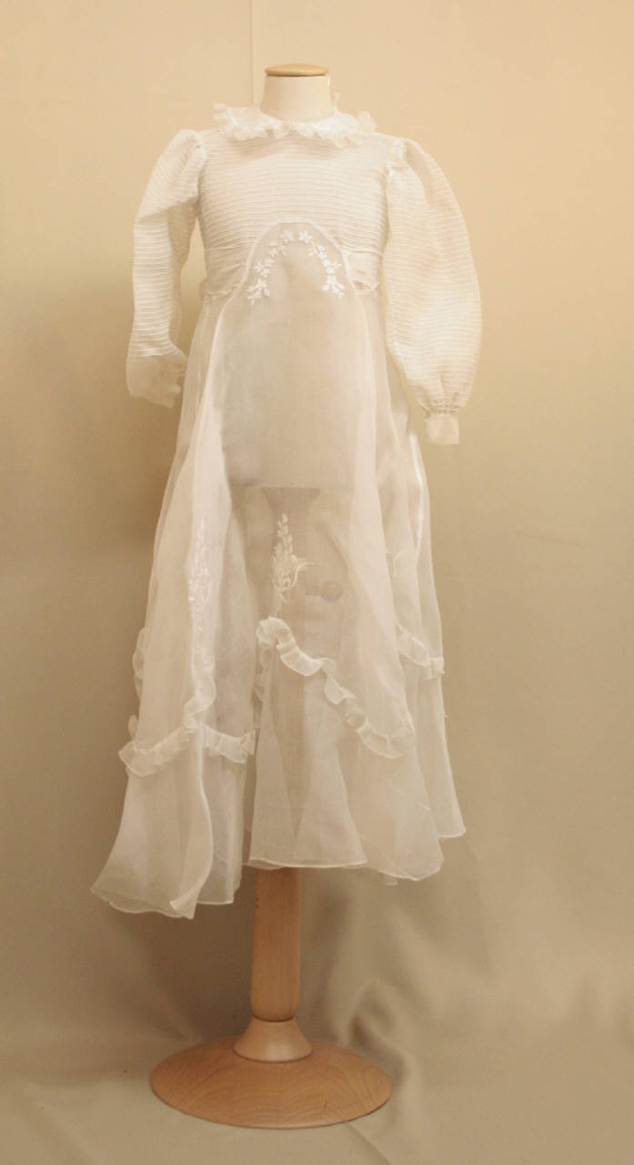 Abito lungo da Prima Comunione in crespo leggerissimo bianco. Corpino a fitte nervature orizzontali, girocollo con collo semplice profilato da ruches. Apertura posteriore con bottoni. Maniche lunghe arricciate con polsino. Gonna a ruota, con ruche disposte presso l'orlo a descrivere smerli. Cinturini da annodare dietro inseriti in vita. Ricamo nel collo e nella gonna a punto ombra in bianco.