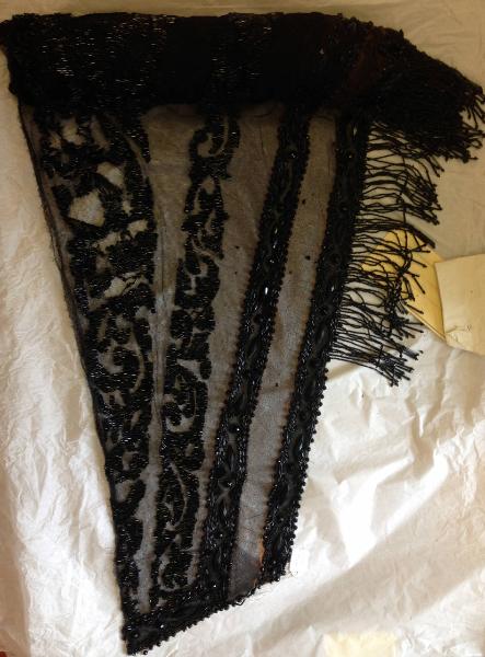 Forma triangolare, con estremità molto allungate. In tulle bobbinet di seta nera, ricamato con cannette e perline di vetro nero, losanghe e semisfere sfaccettate in jais fermati ad ago. Doppiato in tulle. Decoro disposto in bande lungitudinali a motivi geometrici e vegetali. Il lato inferiore ha alta frangia in perline e cannette.