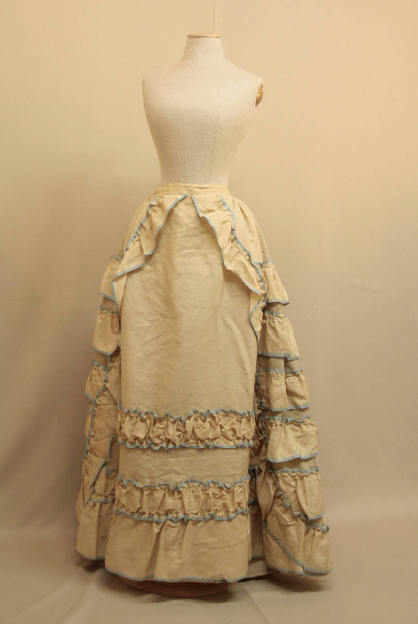 gonna lunga a crinolina asimmetrica, in tela avorio con profilature in taffetas celeste. Davanti ad un telo, dietro in 3 teli di tessuto analogo ma non identico, ristretti in vita da fitta pieghettatura; apertura posteriore centrale con ganci. Decorata da 2 gale che dal punto vita scendono oblique fino all'orlo definendo una sorta di grembiule, decorato da due gale orizzontali; proseguono sul dierto lungo l'orlo. Sul dietro dai fianchi all'orlo 5 gale analoghe. Fodera perduta.