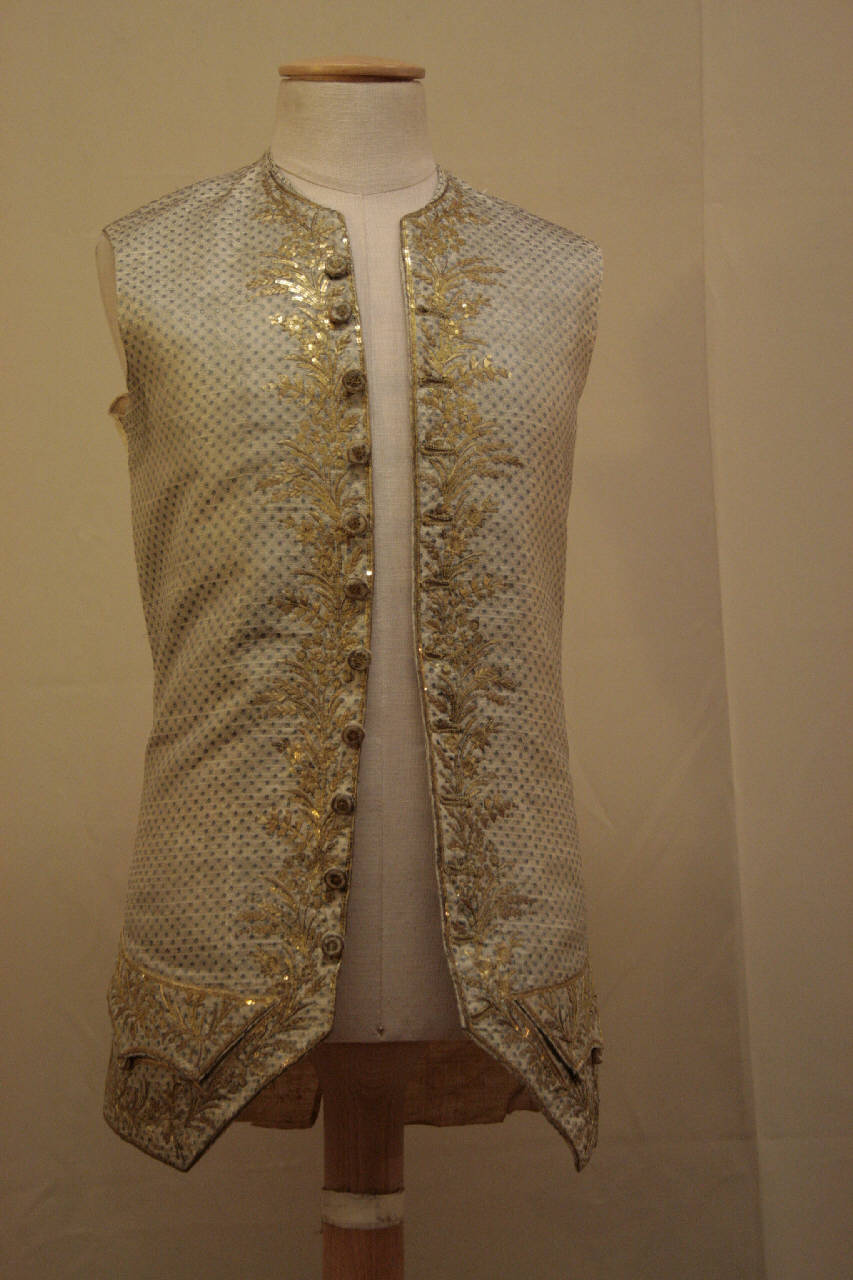 Gilè in taffetas effetto gros, operato, a pelo strisciante, lanciato, con fondo avorio lanciato argento e decoro a piccoli pois azzurri con dettaglio lanciato oro; ricamato in oro filato a punto pieno e paillettes dorate a punto indietro.\nGirocollo, mostre diritte chiuse da 11 bottoni e occhielli corrispondenti dallo scollo al fondo; il bottone corrispondente all'asola più bassa è stato spostato in alto. Falde divergenti a punta , con tasche sotto i fianchi e patte sagomate; 3 bottoni nel sottotasca. Dorso in tela naturale.\nSottoposto a intervento di restauro che potrebbe aver alterato la confezione originali (es. al centro dietro cucitura a macchina che restringe il gilè).