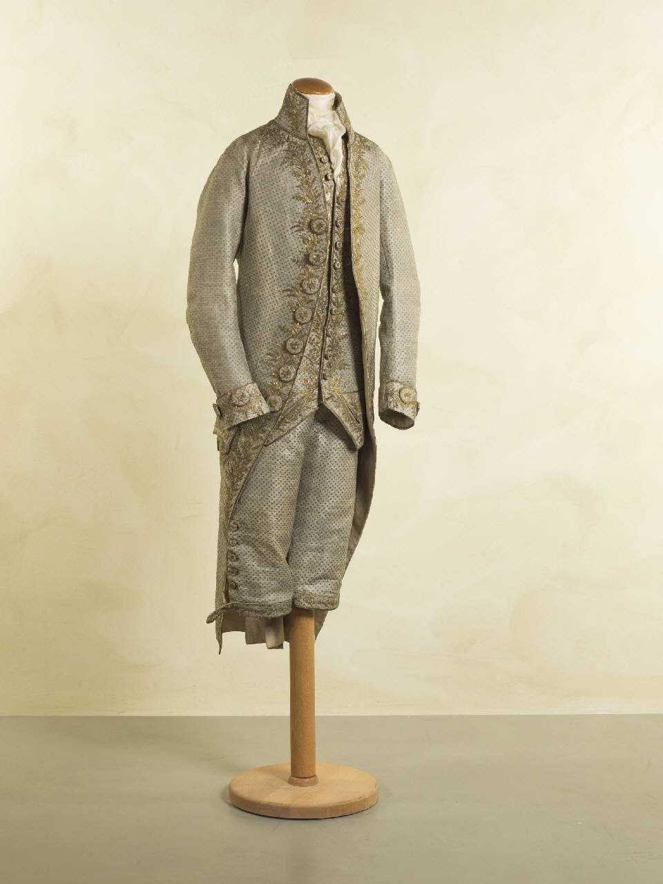 marsina in taffetas effetto gros, operato, a pelo strisciante, lanciato, con fondo avorio lanciato argento e decoro a piccoli pois azzurri con dettaglio lanciato oro; ricamato in oro filato a punto pieno e paillettes dorate a punto indietro.\nCollo a cinturino (h 7,5 cm), mostre appena stondate con 7 bottoni rivestiti dal torace in giù e 2 occhielli funzionali all'altezza del torace.\nFalde molto sfuggenti verso il dietro. Tasche sotto i fianchi con patta sagomata e 3 bottoni decorativi sotto la patta.\nManiche lunghe, aderenti, sagomate con basso paramani ( probabilmente modificato) con 2 bottoni decorativi.\nDorso stretto che scende sotto il punto vita; spacchi laterali aperti entro doppia piega decorati da bottoni in alto e all'orlo; spacco centrale.\nFodera in diagonale avorio.\nSottoposto a restauro che potrebbe aver alterato la confezione originale.