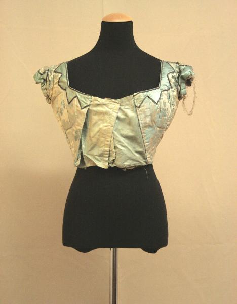 Corpino aderente, con stecche, in damasco di Tour celeste e azzurro con motivo a rami di rose. Corto alla vita, davanti in 4 pezzi, con punta centrale che scende oltre la vita, dietro in 2 pezzi sagomati da pinces, con apertura centrale alterata con inserimento di bande di tessuto diverso celeste, con cuciture a macchina e senza sistema di chiusura. \nScollo rettangolare molto ampio profilato da applicazione a denti di lupo in raso celeste profilata da spighetta argentata. Cortissime maniche a palloncino con decoro analogo allo scollo; profilate al fondo da merletto bianco in buona parte perduto. \nFodera in tela bianca, nastro stringivita. All'interno imbottitura nella parte posteriore delle spalle e sotto i giromaniche.\nIl corpino è stato modificato nelle dimensioni.