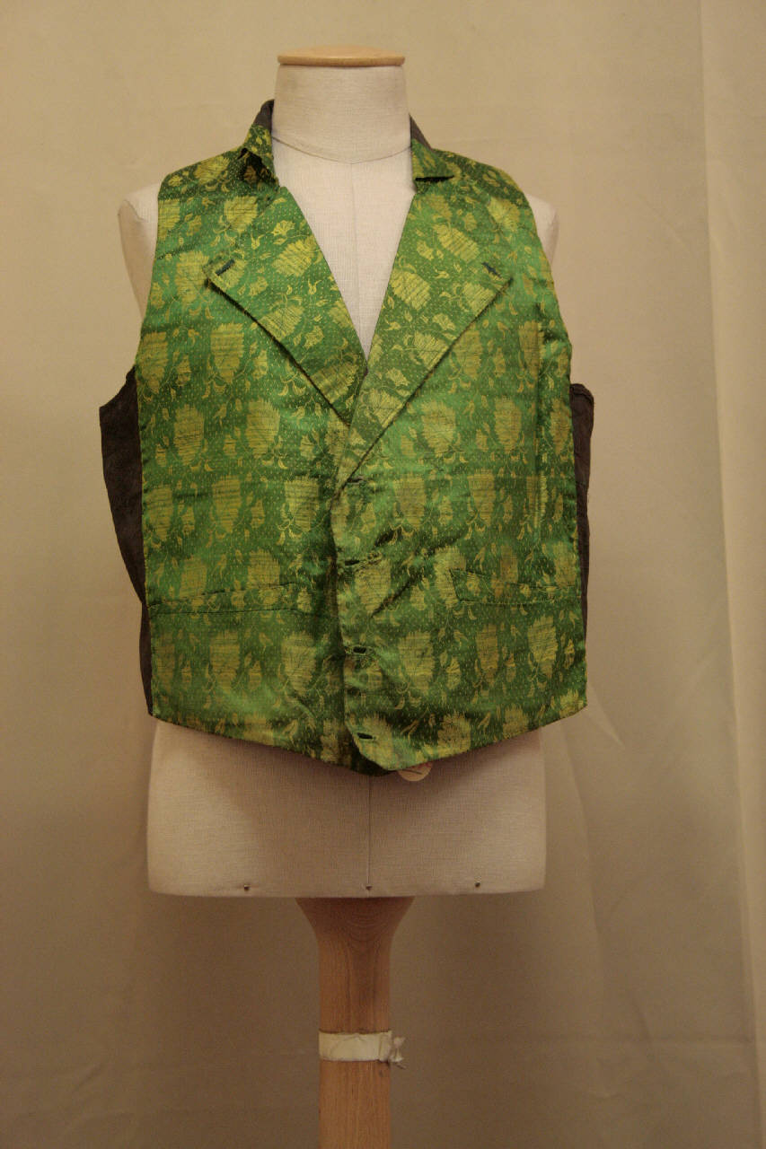 Gilè in raso operato liseré, con fondo verde e motivo a foglie giallo-verde poste a scacchiera . Collo a cinturino (h 5,5 cm) con risvolti fermati ciascuno da 1 bottone (perduto). Chiusura a doppio petto, con 4 coppie di bottoni perduti. Tasche con patte cucite. Fodera e dorso in tela nera cerata. Dietro regolabile con coppia di corti cinturini con occhielli in metallo e laccio passante.