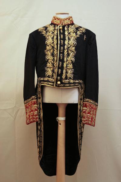 Uniforme civile composta da giacca frac e pantaloni in panno nero.\na)Giacca tagliata in vita; apertura con 9 bottoni dorati, collo a cinturino in velluto rosso, maniche in due pezzi con alto paramani in velluto rosso. Ai lati dell'apertura, sul collo, paramani e lungo le falde, ricami dorati (oro filato, canutiglia, paillettes) a punto posato, raffiguranti tralci di alloro intrecciati a spighe; lungo i profili serie di nodi Savoia. Nei paramani le lettere del motto FERT sono intercalate ai nodi. Sulla spalla sinistra è ricamato il distintivo del Fascio Littorio. \nSul dietro lunghe falde stondate, con spacco centrale affiancato da due finte pieghe decorate da bottoni dorati. Fodera in raso nero; nelle maniche in diagonale bianca.\nb) Pantaloni di linea diritta, con bande laterali in gallone dorato decorato con nodo Savoia.\nNei pantaloni etichetta in nastro stampato