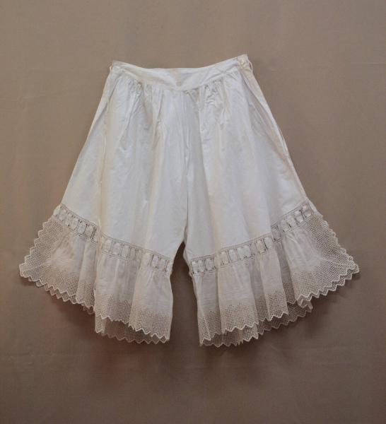 Ampie mutande lunghe al ginocchio in tela bianca con inserti e balze al fondo in tela bianca ricamata a macchina (broderie anglaise). Aperte sui fianchi, chiusi da laccetti e bottoni sul cinturino che raccoglie l'arricciatura al punto vita. L'ampiezza delle gambe poteva essere raccolta da un nastro passante nell'inserto entredeux predisposto.\nDavanti al centro ricamate a punto cordoncino in cotone bianco le iniziali GR.