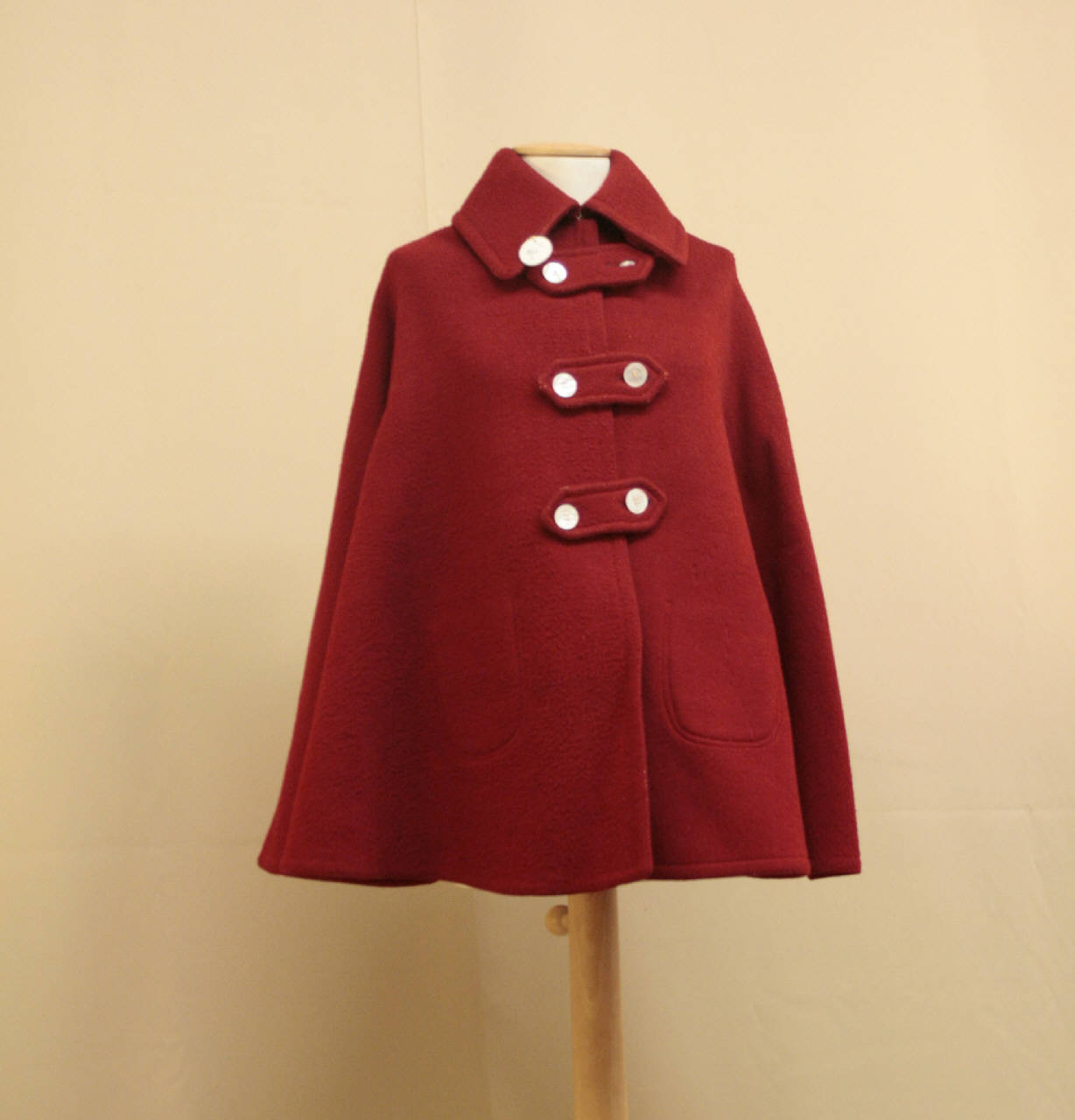 mantella cappa a ruota, corta sotto i fianchi, in diagonale double face, rosso al diritto e scozzese bianco, rosso, verde, blu, al rovescio. Girocollo con collo semplice, chiuso da fascetta con bottoni. Apertura anteriore con 3 alamari in tessuto con bottoni. Cappuccio staccato, con frangia, a cui è stata tagliata via la base con automatici per fissarlo alla cappa sotto il collo. All'interno del collo sono inserite 2 lunghe bretelle nello stesso tessuto per fissare la cappa alle spalle.\nAll'interno, sotto ilcollo, etichetta in nastro operato con marchio.