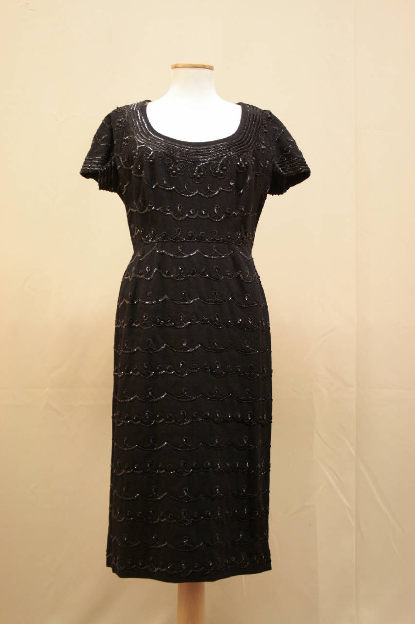 abito lungo al polpaccio, in crespo nero, ricamato con paillettes nere su tutta la lunghezza con motivo a festone; scollo e maniche profilati da fitti giri di paillettes nere. Il crespo è doppiato in tela nera.\nAmpio scollo rotondo, maniche corte a chimono. Sul dietro la parte centrale del dorso è costituita da un pannello libero al punto vita con effetto bolero. Cerniera sul fianco sinistro.\nEtichetta in nastro operato all'interno, sul fianco sinistro.