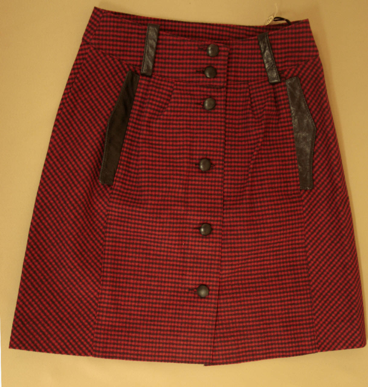 gonna corta svasata in diagonale a minuta quadrettatura rosso e nero. Alta baschina con due passanti in similpelle nera; davanti in 4 teli con apertura totale al centro davanti chiusa da 6 bottoni rivestiti in similpelle. Due tasche verticali inserite nelle cuciture dei teli anteriori con patta sagomata in similpelle. Dietro in 2 teli laterali sbiechi e due centrali in drittofilo, con 2 pences aperte sotto la baschina. \netichette all'interno, al centro dietro in nastri stampati e operati.