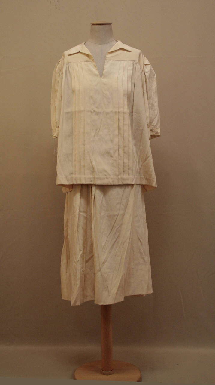 blusa e gonna in crespo (crepe cady) avorio. Blusa ampia, girocollo con collo semplice rovesciatoa punte. Apertura parziale anteriore centrale senza chiusura. Sprone posteriore a punta e anteriore diritto che sostiene morbida arricciatura e 4 pieghe piatte ai lati dell'apertura; le pieghe sono cucite all'orlo. Maniche larghe a 3/4 con piccole pieghe a cannone, arricciate al fondo e chiuse da polsino con bottone in plastica. All'interno alette di sostegno. Gonna lunga al polpaccio, con due gruppi di pieghe sul davanti e sul dietro. Al punto vita cinturino gros grain; sotto il punto vita 3 passanti in tessuto sostengono cintura nello stesso tessuto con fibbia bianca. Tasche applicate con finta patta triangolare. Apertura sul fianco sinistro con cerniera e gancio.\nEtichetta in nastro operato all'interno della blusa.\nLa gonna è stata accorciata e le pieghe aperte.