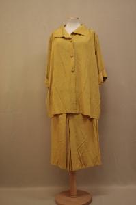 camicia e gonna in crespo (crepe cady) giallo senape. Camicia ampia, girocollo con collo sciallato a punte. Apertura anteriore centrale con 3 bottoni rivestiti. Sprone posteriore diritto che sostiene piega centrale a cannone. Sul davanti piccolo sprone che sostiene morbida arricciatura. Maniche larghe a 3/4 con piccolo paramani. All'interno alette di sostegno. Gonna lunga al polpaccio, a cannoni doppi centrali. Al punto vita cinturino in nastro cannellato. Tasche applicate chiuse da bottone rivestito. Apertura sul fianco sinistro con cerniera e ganci.\nEtichetta in nastro operato all'interno della camicia.\nSulla cimosa del tessuto è operato il marchio "Crepe Boivin"