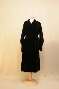 soprabito lungo al polpaccio in velluto in trama, tagliato unito, nero ( potrebbe essere in filato artificiale). Linea diritta, scollo a V con collo sciallato, apertura senza allacciatura. Maniche raglan, lunghe a coprire la mano, sagomate a formare rimborso sotto il gomito, svasate al fondo con spacco. Stretta cintura nello stesso tessuto, non fissata al soprabito. Fodera in raso nero con profili alle mostre in crespo rosso.\nAll'interno sul dorso etichetta in nastro operato.