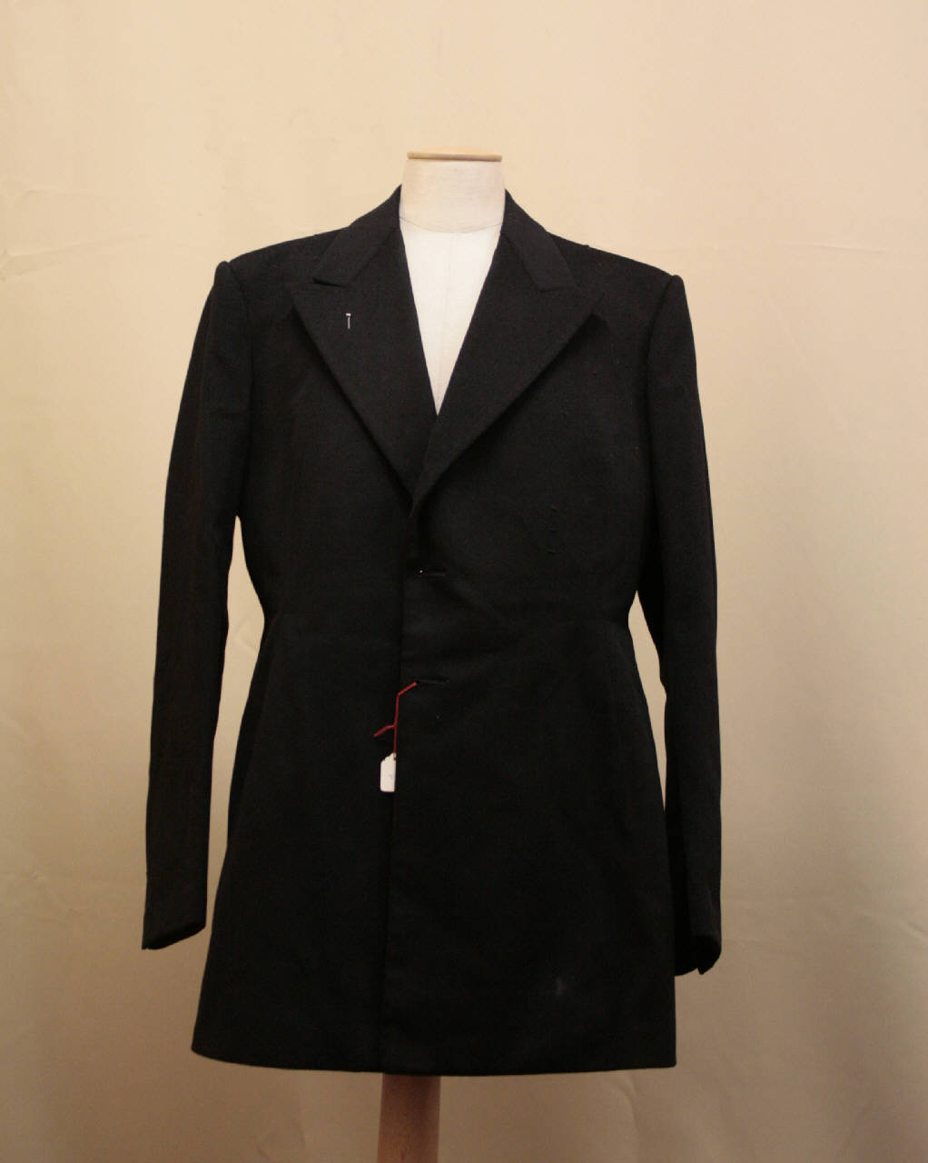 Completo composto da giacca e pantaloni in panno nero. Giacca con collo con risvolti a lancia, chiusa da 3 bottoni (perduti). Resa aderente al busto da pinces sul davanti e sul dietro, dove è tagliata in vita, con falde leggermente svasate e spacco centrale. maniche con spacco al fondo chiuso da 2 bottoni (perduti). Sulla giacca sono realizzate asole in filo, per fissare medaglie, mostrine e spalline.\nPantaloni alti in vita, di linea morbida, con pinces apertesul davanti. Patta verticale con bottoni. Tasche inserite sui fianchi e a con patta cucita dietro. All'esterno delle gambe èapplicato nastro in seta nera con passamaneria dorata centrale.\nAll'interno della giacca, nel collo, etichetta in nastro operato "Unione Militare".